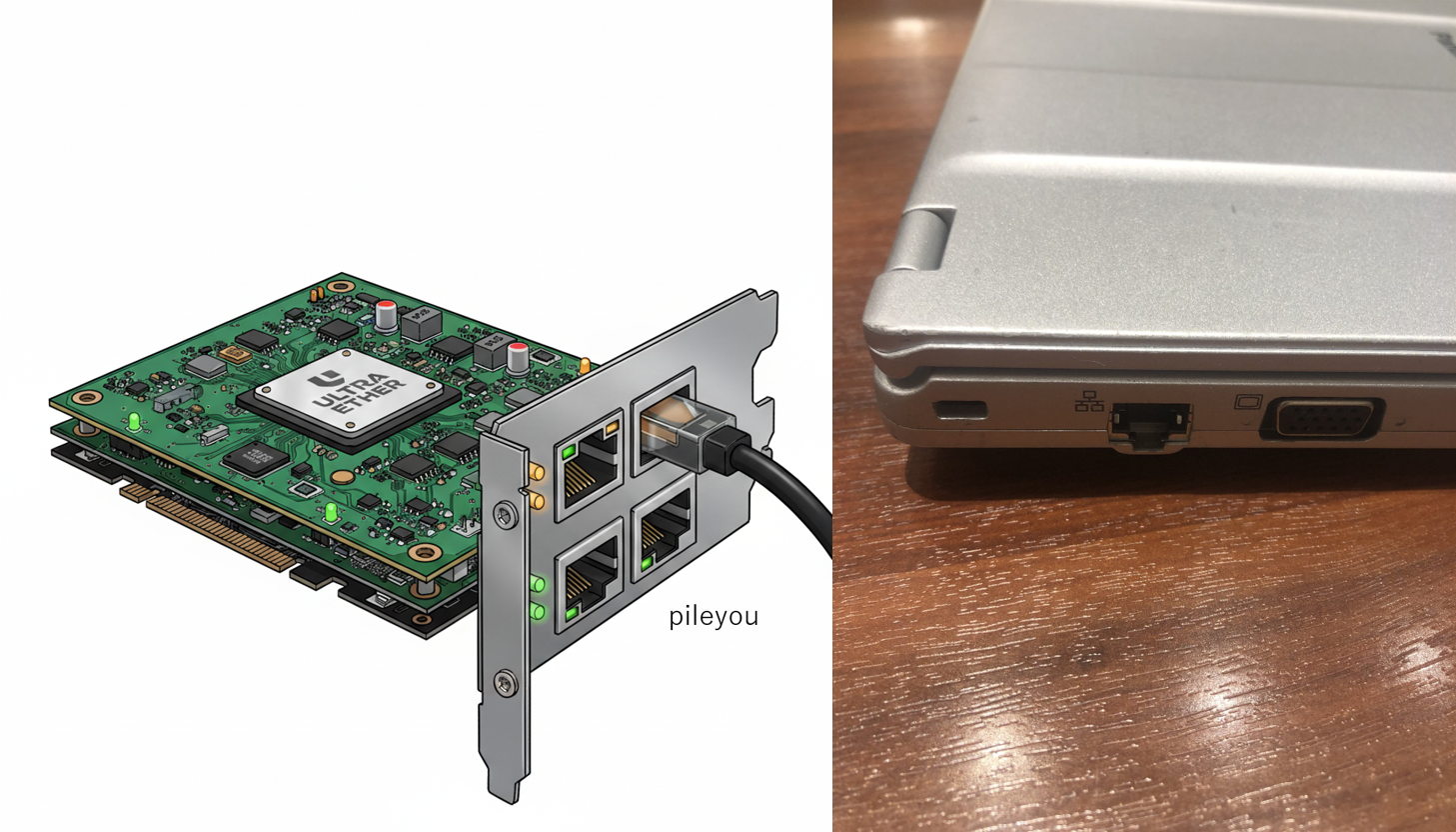 NIC(RJ45)はLANケーブルの受け口を搭載したカードで、左がデスクトップパソコン、右がノートパソコンです。