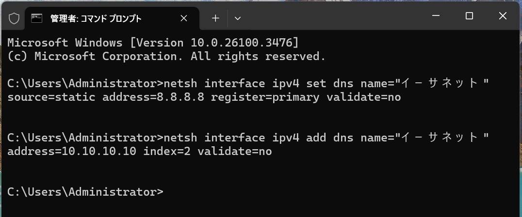 netsh interface ipv4 add dns name="イーサネット" address=10.10.10.10 index=2 validate=no