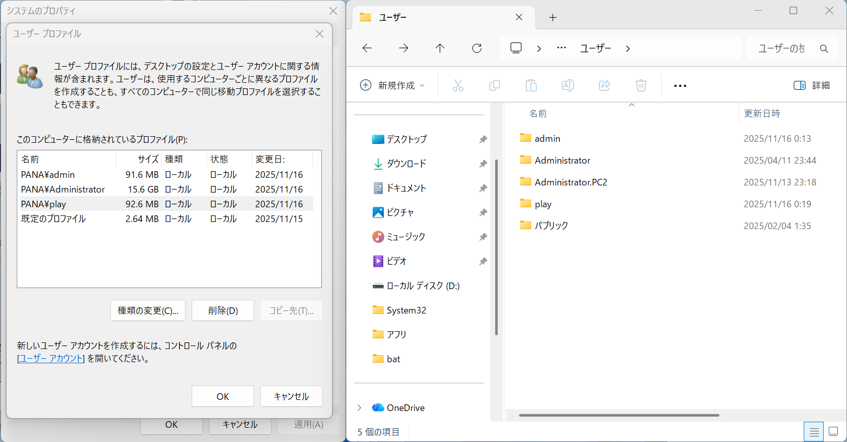 システムのプロパティ > 詳細設定 > ユーザープロファイル