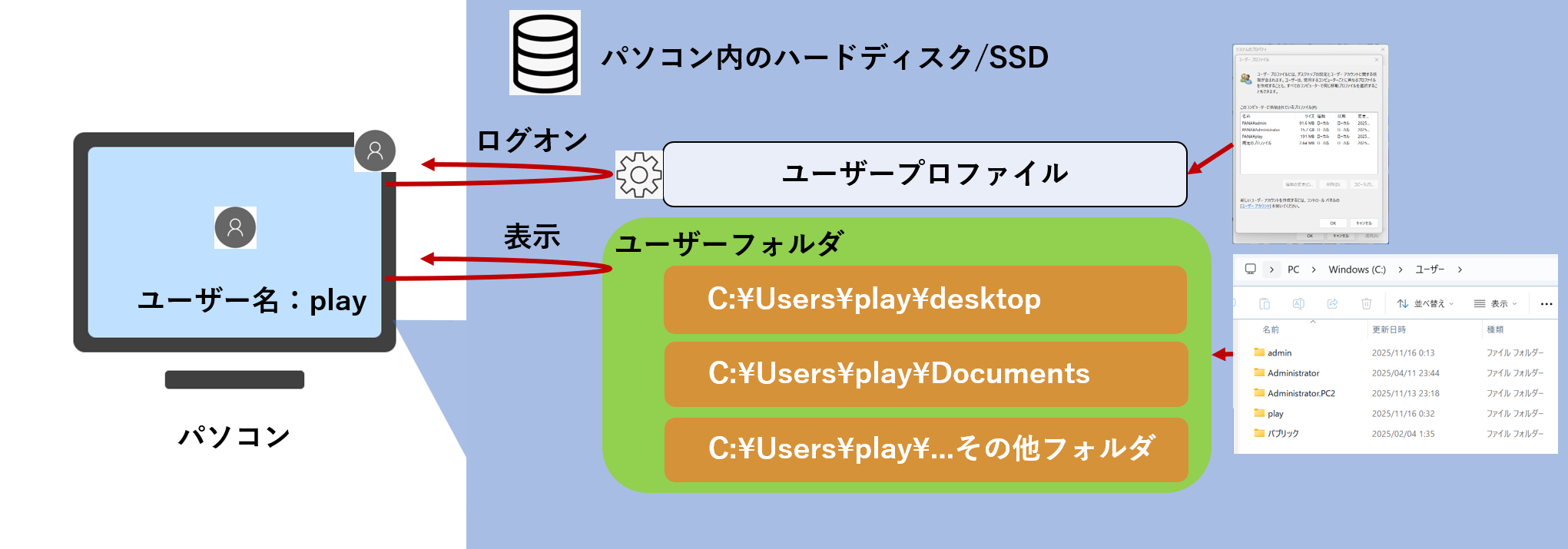デスクトップ上のファイルなど実際のデータは「ユーザーフォルダ」に格納されています。(右)