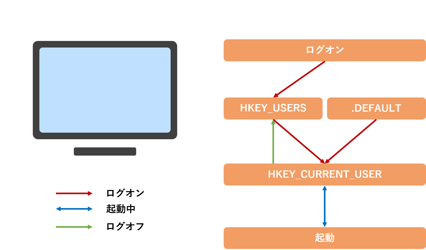 起動中は「HKEY_CURRENT_USER」の情報を毎回書き換え、ログオフ時は「HKEY_USERS」に情報を保存して終了します。