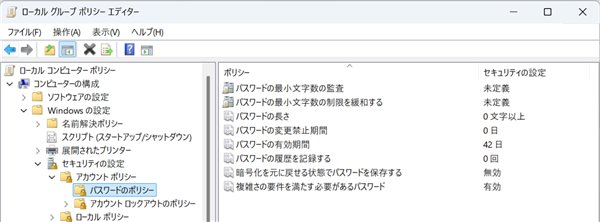 ローカルコンピューターポリシー>コンピューターの構成>Windows の設定>セキュリティの設定>アカウント ポリシー>パスワードのポリシー