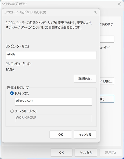 システムのプロパティ>「コンピューター名」タブ>変更>●ドメイン
