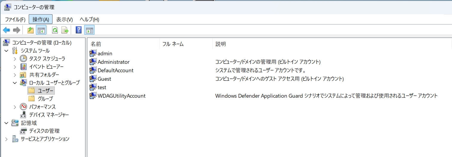 ※WindowsOSシステム用ユーザー(SYSTEM、LOCAL SERVICE、NETWORK SERVICE)は表示されません。