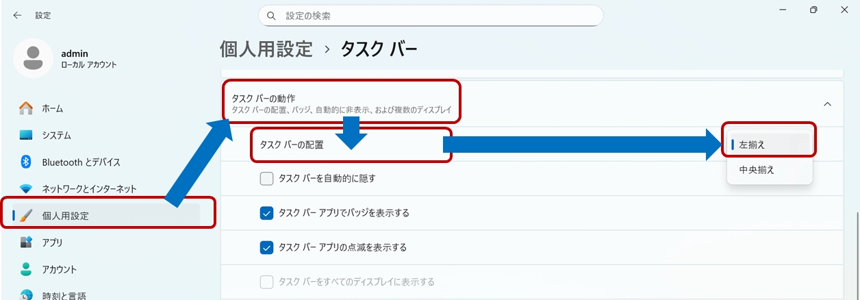 設定 > 個人用設定 > タスクバー > タスクバーの配置 > 左揃え
