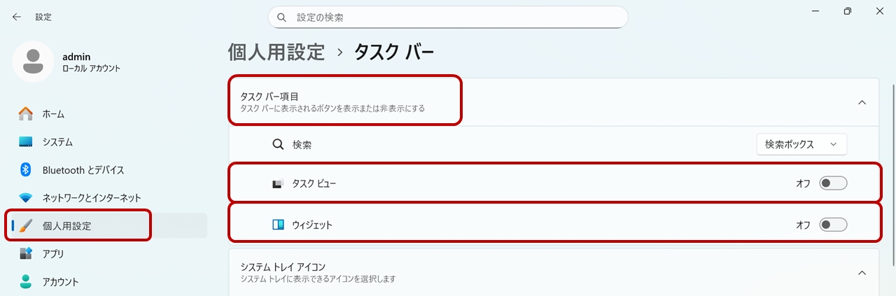 設定 > 個人用設定 > タスクバー > タスクバー項目 > ウィジェット(OFF)