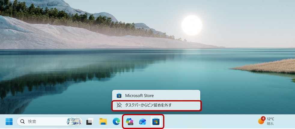 タスクバーの不要なアイコンを右クリックし、「タスクバーからピン留めを外す」を選択します。