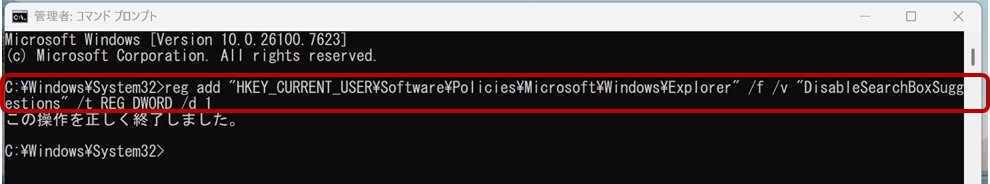 reg add "HKEY_CURRENT_USER\Software\Policies\Microsoft\Windows\Explorer" /f /v "DisableSearchBoxSuggestions" /t REG_DWORD /d 1