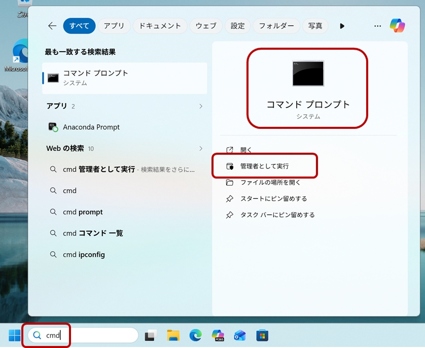 検索ボックスに「cmd」と打つとコマンドプロンプトが出てきますので、「管理者として実行」を選択します。