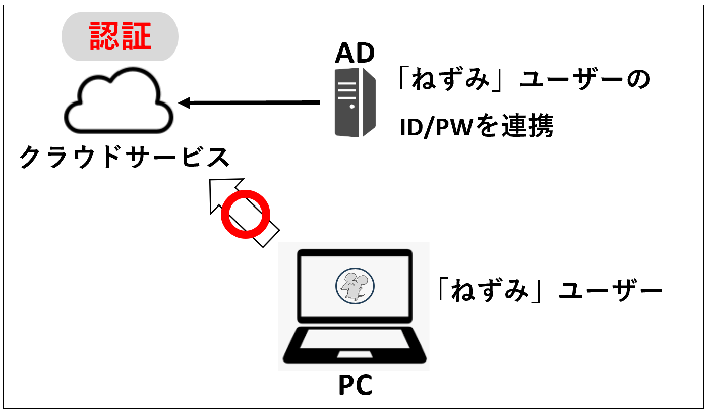 この例では、ADは認証を行うのではなく、ID/PW情報をクラウドサービスに渡しているだけです