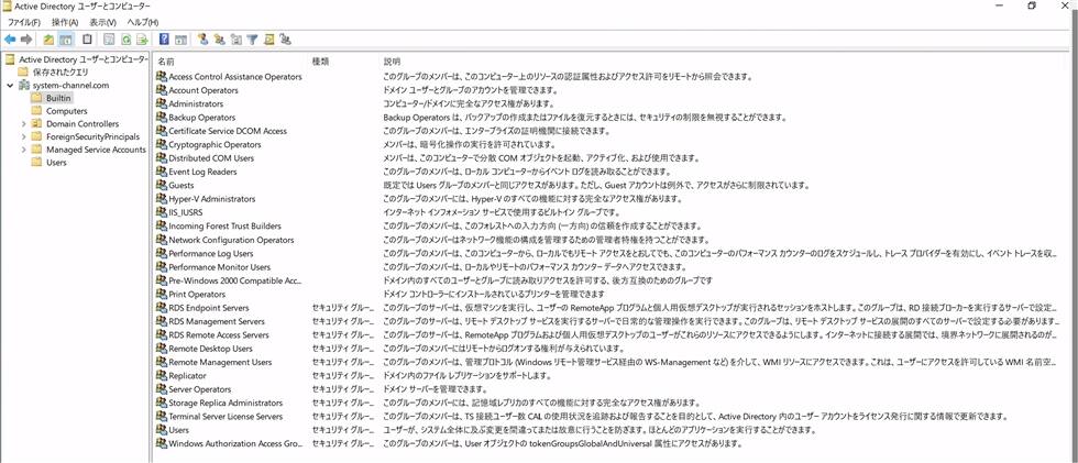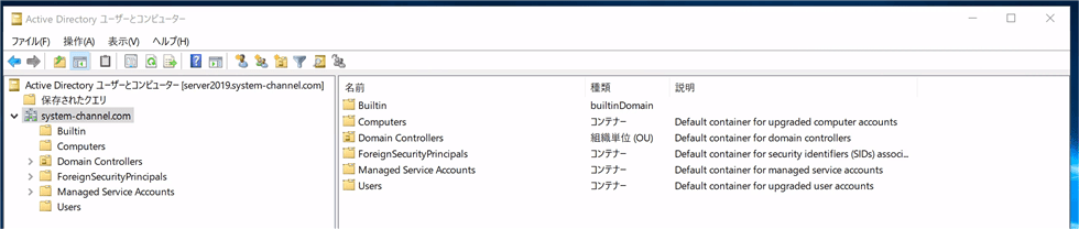 「ユーザーとコンピューター」ツールでは、ドメインで利用する下記のようなオブジェクトが階層構造で配置され、集中管理ができます。