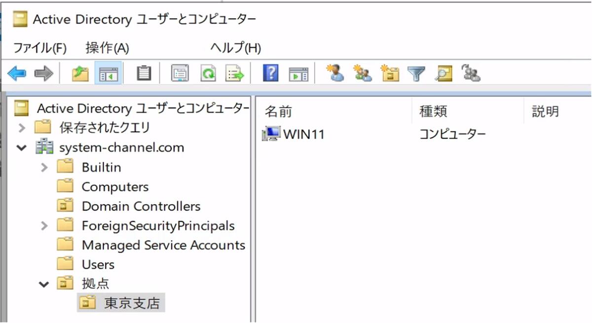 コンピューターアカウントは、下記のように「拠点>拠点名」OU配下で管理されるケースをよく見かけます。